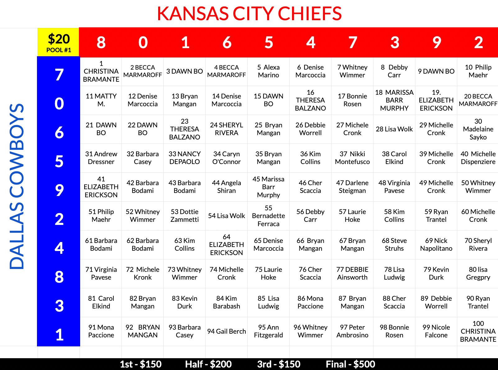 Once all the squares are filled, we’ll randomly draw numbers 0–9 for each Super Bowl team and assign them to the rows and columns on the grid. These numbers represent the last digit of each team’s score.